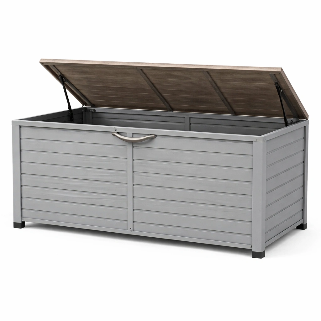 Este baúl de almacenamiento para exterior está fabricado en acero galvanizado y madera tratada con un revestimiento resistente al agua. Tiene una estructura robusta con bisagras de sujeción metálicas.