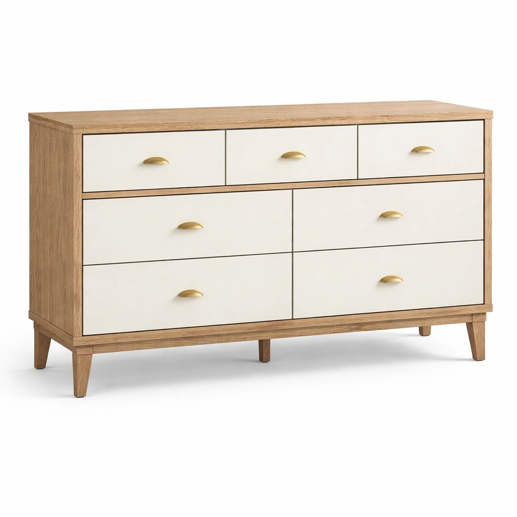 Tiene un diseño con color Blanco, Roble y Dorado. Dispone de 7 cajones con tiradores metálicos dorados y patas de madera.